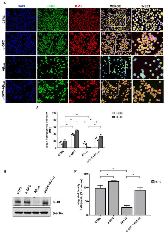 α-GPC contributes to the switching of microglia toward a pro-inflammatory phenotype. (A) Representative images (original magnification 20×; inset 40×) of the fluorescent immunocytochemical detection of CD68 and IL-10 expression in BV2 cells pre-treated for 1 h with α-GPC (1 μM) and treated for 48 h with Aβ1–42 (5 μM) and the respective mean fluorescence intensity (MFI) analysis (A’), the boxes in the fourth column represent the selected magnified area shown in the fifth column (inset). (B) Western blot for IL-10 protein expression in BV2 cells and the respective densitometric analysis (B’). The data are expressed as means ± S.E.M. One-way ANOVA and the Bonferroni post-hoc test were used to determine statistical significance. * p < 0.05.