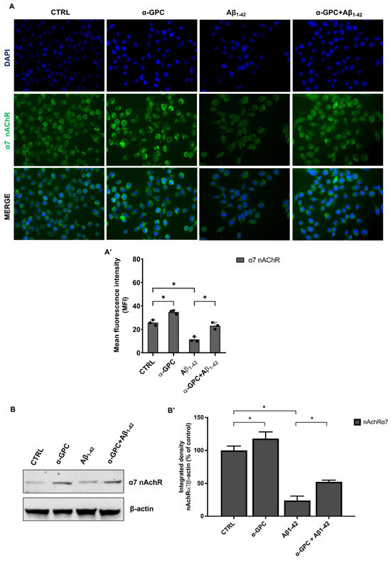 α7 nAchR is modulated by α-GPC treatment. (A) The fluorescent immunocytochemistry detection (original magnification 20×) of α7 nAChR in BV2 cells pre-treated with α-GPC (1 μM) and treated for 48 h with Aβ1–42 (5 μM) and the respective mean fluorescence intensity (MFI) analysis (A’). (B) Western blot for α7 nAChR protein expression in BV2 cells and the respective densitometric analysis (B’). The data are expressed as means ± S.E.M. One-way ANOVA and the Bonferroni post-hoc test were used to determine statistical significance. * p < 0.05.