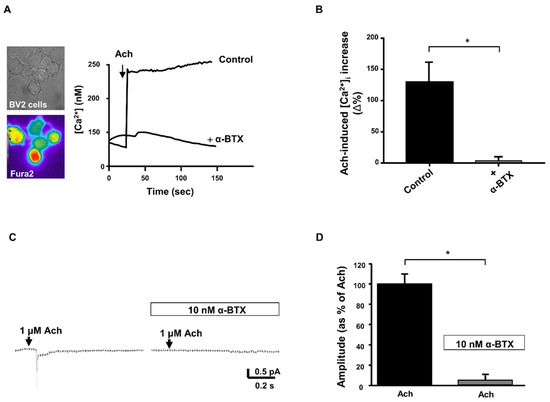 Effect of α-bungarotoxin on acetylcholine-induced [Ca2+]i increase and acetylcholine-induced inward current in microglial BV2 cells. (A) Representative traces and quantification (B) for the effect of acetylcholine (Ach, 1 µM) alone or in the presence of α-bungarotoxin (10 nM) on [Ca2+]i, expressed as the Δ% increase peak over basal values (N = 40 cells for Ach and N = 35 cells for Ach + α-BTX). On the left, the representative brightfield and pseudocolor images of Fura-2 loaded BV2 cells are shown. (C) Representative current traces in response to Ach (1 µM) alone or in the presence of α-BTX (10 nM), and the quantification of current amplitude (D). The values are expressed as the mean ± SEM of three independent experimental sessions (N = 8 cells for Ach and N = 10 cells for Ach + α-BTX). * p < 0.05.