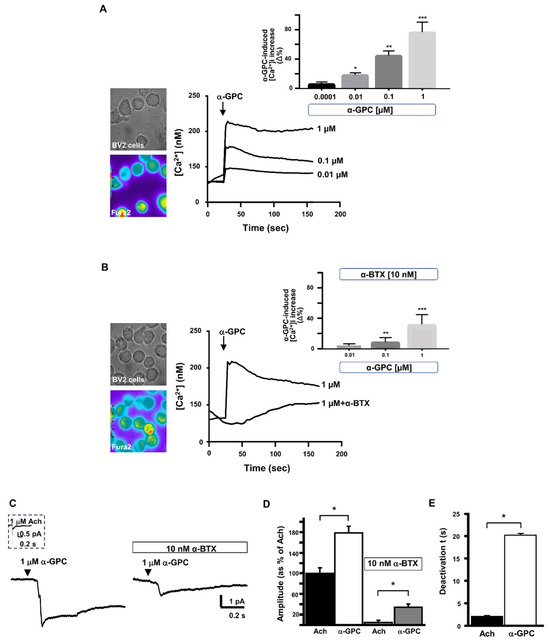 Effect of α-GPC on [Ca2+]i increase and the α7-nAChR-encoded inward current in microglial BV2 cells. (A) Representative traces and quantification (B) for the effect of different concentrations of α-GPC (0.01–1 µM) alone or α-GPC (1 µM) + α-BTX (10 nM) on [Ca2+]i, expressed as the Δ% increase peak over basal values (N = 35 cells for α-GPC and N = 30 cells for α-GPC + α-BTX). On the left of each panel, the representative brightfield and pseudocolor images of Fura-2 loaded BV2 cells are shown. * p < 0.05 vs. control (basal values) and 0.0001 µM; ** p < 0.05 vs. control and 0.01 µM; *** p < 0.05 vs. all. (C) Representative traces of Ach-like currents elicited by α-GPC (1 µM) alone or + α-BTX (10 nM), and the quantification of current amplitude (D). The values are expressed as the mean ± SEM of three independent experimental sessions (N = 9 cells for α-GPC and N = 12 cells for α-GPC + α-BTX). (E) Quantification of the slow deactivation induced by α-GPC. * p < 0.05.