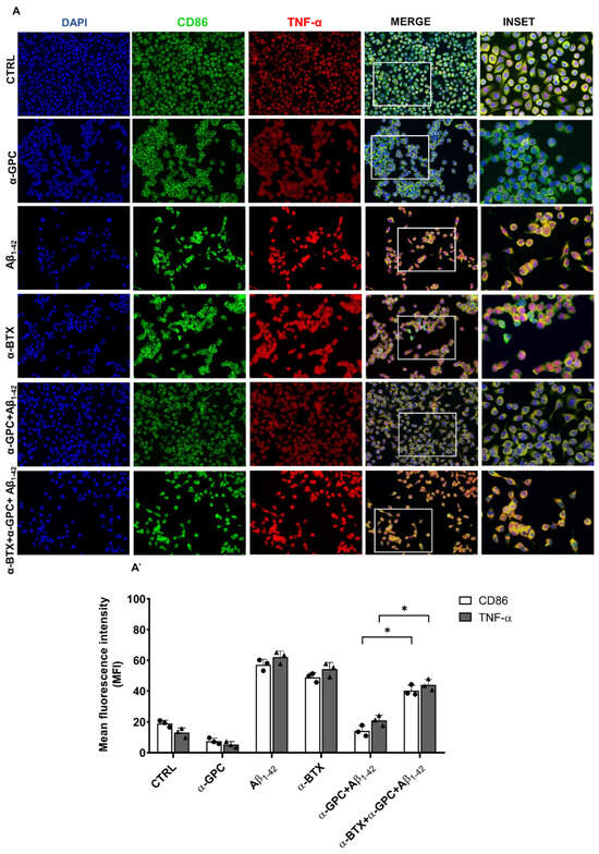 α-BTX restores the expression of pro-inflammatory molecules. (A) Representative images (original magnification 20×; inset 40×) of the fluorescent immunocytochemical detection of CD86 and TNF-α expression in BV2 cells pre-treated for 1 h with α-GPC (1 µM) and treated for 48 h with Aβ1–42 (5 μM)/α-BTX (100 nM) and the respective mean fluorescence intensity (MFI) analysis (A’), the boxes in the fourth column represent the selected magnified area shown in the fifth column (inset). The data are expressed as means ± S.E.M. Differences between the groups were considered significant at * p < 0.05 (One-way ANOVA followed by the Bonferroni post-hoc test).