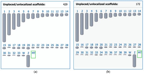 Figure 1. Ideogram view in the NCBI Genome Data Viewer for two chicken (Gallus gallus, GGA) representative genome assemblies. (a) The previous assembly GRCg6a (GCF_000002315.6) released on 27 March 2018 with 1 to 33 autosomes. (b) The latest assembly bGalGal1.mat.broiler.GRCg7b (GCF_016699485.2) as of 19 January 2021 has 1 to 39 autosomes (including macrochromosomes GGA1–GGA9 and microchromosomes GGA10–GGA39) and fewer unplaced scaffolds as a result of work later published in Huang et al. [133]; Z and W, sex chromosomes; MT, mitochondrial genome.