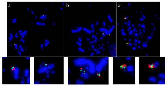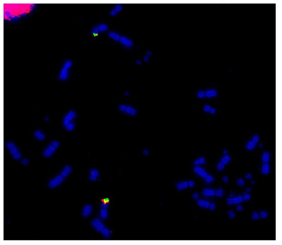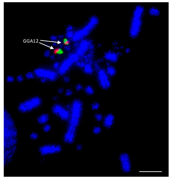 As the best-characterized avian species with the largest number of BAC libraries available, e.g., [139], the chicken was used as the reference avian species in most of the studies. BACs located in the most distal (where possible) regions of the p- and q-arms of chromosomes 1–28 were selected according to the selection criteria described by Damas et al. [132]. The co-hybridization of p- and q-arm BACs for each chromosome was performed to verify correct mapping of the BACs, producing bright punctate signals for each of the chicken chromosomes, an example of which is shown for chicken chromosome 12 (GGA12) in Figure 2.