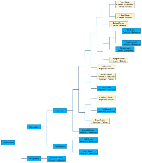 While several studies demonstrated that interchromosomal rearrangements involving macro- and microchromosomes have played a role in the karyotype evolution of Ciconiiformes, Falconiformes, and Psittaciformes, recent studies have also observed this type of rearrangement in Caprimulgiformes, Cuculiformes, Suliformes, and Passeriformes species [140,142]. However, in these studies, only one representative species was investigated (Caprimulgiformes, Cuculiformes, and Suliformes) or the rearrangements were found only in one species (Passeriformes). Future studies are therefore necessary to explore whether these fusions are species-specific or are a common feature of each order. Most species of Passeriformes demonstrate the typical avian karyotype, as evidenced using microchromosomal BAC FISH, where only one species (Tolmomyias sulphurescens, 2n = 60, Rhynchocyclidae) from seven demonstrated microchromosomal fusions [142]. It is likely that the low diploid number is specific to the Rhynchocyclidae family, while remaining conserved in other Passeriformes species [142].