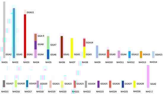 Figure 6. Ideogram representing karyotypic structure of the cockatiel (Nymphus hollandicus, NHO) illustrating an overall structure. Each chicken (GGA) homolog is represented as a different color.