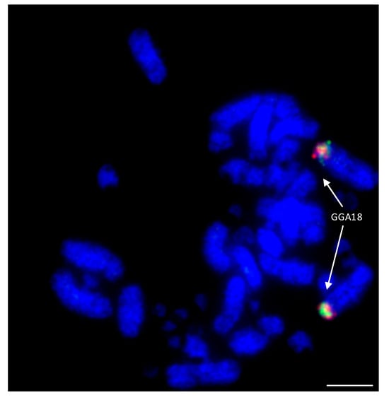 Figure 2. Example of dual FISH results for chicken (Gallus gallus—GGA) chromosome 12 to confirm correct mapping. The p-arm BAC (CH261-88K1) is labelled with FITC (fluorescein isothiocyanate) (green) and the q-arm BAC (CH261-152H14) is labelled with Texas Red (red). Scale bar 10 μm.