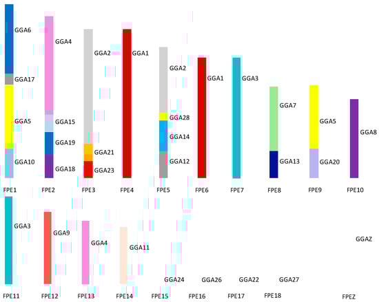 Figure 8. Ideogram representing overall karyotypic structure of the peregrine falcon (Falco peregrinus—FPE) illustrating an extensive amount of interchromosomal rearrangement throughout the karyotype. Each chicken (GGA) homolog is represented as a different color.