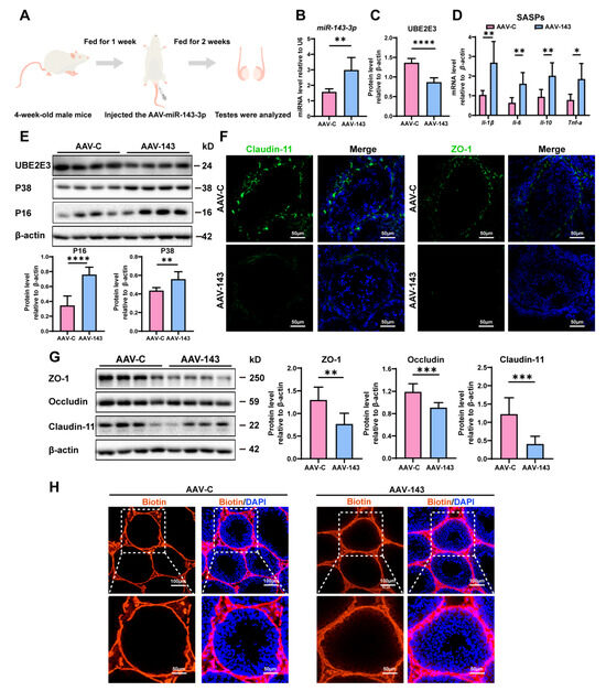 Chicago/Turabian StyleXiao, Ziyan, Jinlian Liang, Rufei Huang, Derong Chen, Jiaxin Mei, Jingxian Deng, Zhaoyang Wang, Lu Li, Ziyi Li, Huan Xia, and et al. 2024. "Inhibition of miR-143-3p Restores Blood–Testis Barrier Function and Ameliorates Sertoli Cell Senescence" Cells 13, no. 4: 313. https://doi.org/10.3390/cells13040313