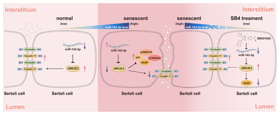 Xiao, Z.; Liang, J.; Huang, R.; Chen, D.; Mei, J.; Deng, J.; Wang, Z.; Li, L.; Li, Z.; Xia, H.; et al. Inhibition of miR-143-3p Restores Blood–Testis Barrier Function and Ameliorates Sertoli Cell Senescence. Cells 2024, 13, 313. https://doi.org/10.3390/cells13040313