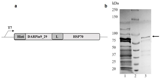 Production of DARPin9_29-HSP70. (a) Gene construct for the expression of the DARPin9_29-HSP70: His6, N-terminal 6-His-tag; DARPin9_29, coding region of DARPin9_29; L, hinge-like linker derived from murine IgG3 hinge region; HSP70, coding region of HSP70; (b) Coomassie blue-stained SDS-PAGE: whole lysate of E. coli strain BL21 after induction with IPTG (Lane 1); molecular weight markers (Lane 2); purified DARPin9_29-HSP70 (Lane 3, arrow).