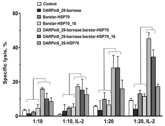 Cytotoxic activity of non- or interleukin-2 activated PBMCs against SK-BR-3 tumor cells planted with HPS70 using the developed constructs. Treated SK-BR-3 cells were incubated with PBMC cells, and cytotoxicity was assessed by the lactate dehydrogenase assay; 1:10; 1:20—ratios of target cells to effectors. The data are presented as mean values with standard deviations. The statistical significance (p < 0.05 by Students’ t-test) is shown with the brackets.