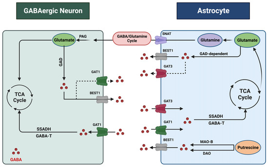 Astrocyte–GABAergic neuron interaction. GABA undergoes extensive recycling between neurons and astrocytes, a process coordinated and regulated by cell-specific transporters and enzymes. Within astrocytes, GABA and glutamate are metabolized, supporting the synthesis of the non-neuroactive amino acid glutamine. Astrocyte-derived glutamine is taken up by neurons and converted to glutamate by phosphate-activated glutaminase (PAG) to replenish the neurotransmitter pool. Sodium-coupled neutral amino acid transporters (SNATs) facilitate glutamate transfer. Astrocytes synthesize GABA from glutamate through a glutamate decarboxylase (GAD)-dependent pathway. Putrescine serves as another precursor for GABA, and monoamine oxidase B (MAO-B) and diamine oxidase (DAO) are the key enzymes in this pathway. Additionally, the BEST1 (bestrophin 1) channel mediates GABA release. GABA transporters recycle excess GABA from the synapse through uptake into neurons and astrocytes. Astrocytes express GAT1 and GAT3, while GABAergic neurons express GAT1. Following uptake, intracellular GABA is metabolized by the enzymes GABA transaminase (GABA-T) and through the intermediate succinate semi-aldehyde by the enzyme succinate semi-aldehyde dehydrogenase (SSADH). This figure was created with BioRender.com (accessed on 17 November 2023).