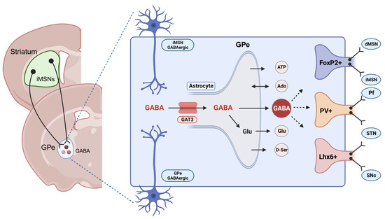 GABA transport in the globus pallidus externus (GPe) neurons. The “GPe” accommodates diverse neuronal populations, such as parvalbumin+ neurons and arkypallidal neurons expressing FoxP2+ and LIM homeobox-positive (Lhx6+) neurons. GABAergic neurons in the GPe receive inputs from the striatal indirect pathway medium spiny neurons (iMSNs). The GPe comprises numerous astrocytes capable of releasing neurotransmitters such as ATP, adenosine, glutamate, D-serine, and GABA [82,83]. GABA transporter 3 (GAT3) is an astrocyte-specific transporter responsible for either releasing into the synapse or metabolizing into the GABA/glutamine cycle. This figure was created with BioRender.com (accessed on 17 November 2023).