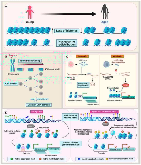 Mechanism of histone loss in aging and senescence. (A) Aging and senescence are characterized by the loss of histones and nucleosome redistribution. Different models show histone loss due to (B) telomere shortening and DNA damage, (C) miRNA-mediated changes to histone transcription, and (D) the imbalance of activating and repressive histone PTMs.