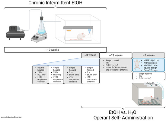 Experimental timeline of the chronic intermittent ethanol exposure and operant self-administration training behavioral model. CIE phase = 10–14 weeks; training phase = 2–3 weeks; EtOH responses and preference stabilization phase = 2–18 weeks; MR1916 treatment phase: 3–4 weeks.