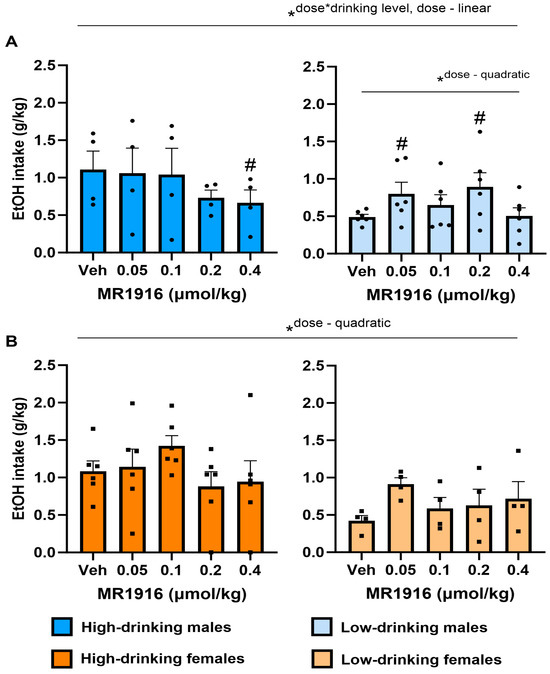 Effects of MR1916 pretreatment (−60 min) on total EtOH intake in post-CIE (A) male and (B) female rats during 2-lever EtOH vs. water self-administration. Left panels show high-drinking (>0.6 g/kg at baseline) rats; right panels show low-drinking rats. Histograms show group M+SEM, and scatter (dot symbols) shows the scores of individual subjects. N = 10/sex; *ANOVA within-subject contrast. Doses marked by the pound sign differ significantly from the respective vehicle control. #, * p < 0.05.