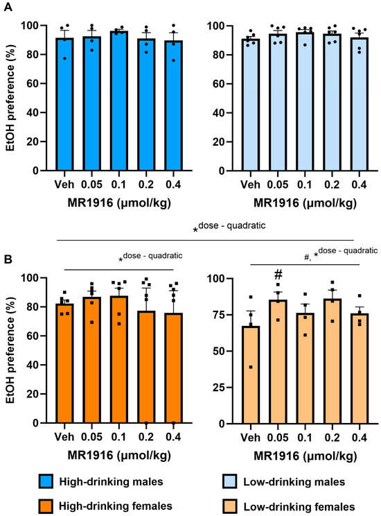 MR1916 pretreatment yielded a significant quadratic Dose contrast (p = 0.023) on the EtOH reinforcer preference of male and female post-CIE rats in the context of a main effect of Sex (p = 0.039). In contrast, MR1916 pretreatment did not significantly alter the EtOH reinforcer preference in male rats alone. However, MR1916 increased the EtOH reinforcer preference in post-CIE female rats alone per a quadratic Dose contrast (p = 0.001, Figure 3). Accordingly, a significant quadratic Dose contrast was seen in both high- (p = 0.034, Figure 3B, left panel) and low- (p = 0.031, Figure 3B, right panel) drinking females considered separately. Pairwise comparisons showed that the lowest dose (0.05 µmol/kg) of MR1916 significantly increased the EtOH reinforcer preference in low-drinking female rats, in comparison to vehicle conditions (p = 0.013, Figure 3B, right panel).