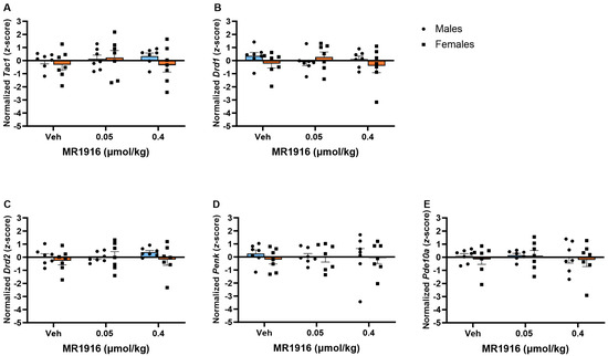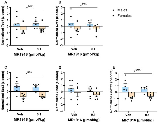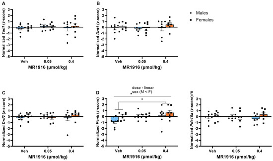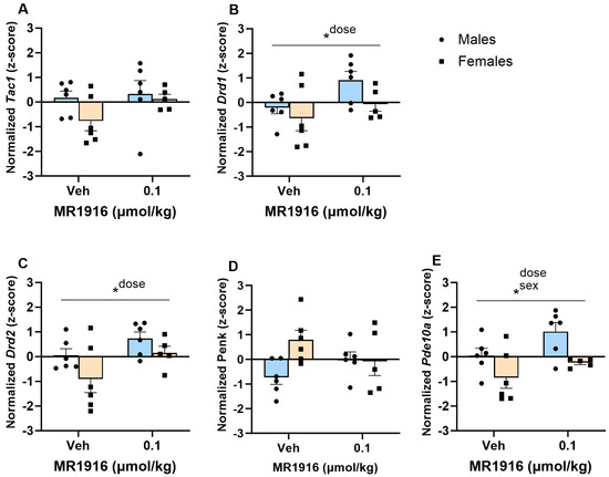Effects of MR1916 on gene expression of (A) substance P (Tac1), (B) dopamine receptor 1 (Drd1), (C) dopamine receptor 2 (Drd2), (D) enkephalin (Penk), and (E) phosphodiesterase 10a (Pde10a), in the dorsal–lateral striatum of EtOH-naïve male (blue fill) and female (orange) rats 90 min after treatment. Each bar represents the mean z-score ± standard error, showing individual values. N = 5–6/treatment/sex. Graph marked by an asterisk and a line have the indicated significant ANOVA effects. * p < 0.05.
