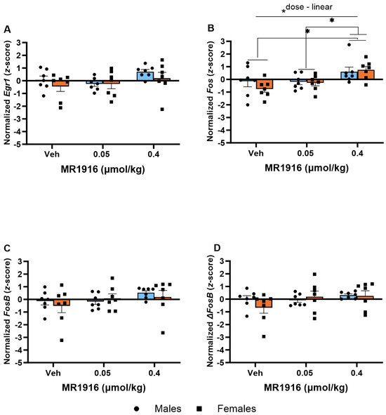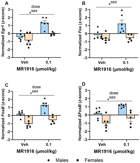 Effects of MR1916 on gene expression of (A) early growth response protein 1 (Egr1), (B) FBJ murine osteosarcoma viral oncogene homolog (Fos), (C) FBJ murine osteosarcoma viral oncogene homolog B (FosB), and (D) delta FBJ murine osteosarcoma viral oncogene homolog B (ΔFosB), in the dorsal–lateral striatum of EtOH-naïve male (blue fill) and female (orange) rats 90 min after treatment. Each bar represents the mean z-score ± standard error, showing individual values. N = 5–6/treatment/sex. Graph marked by an asterisk symbol and a line have the indicated significant ANOVA effects. * p < 0.05.