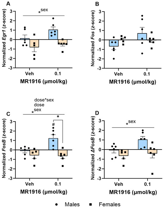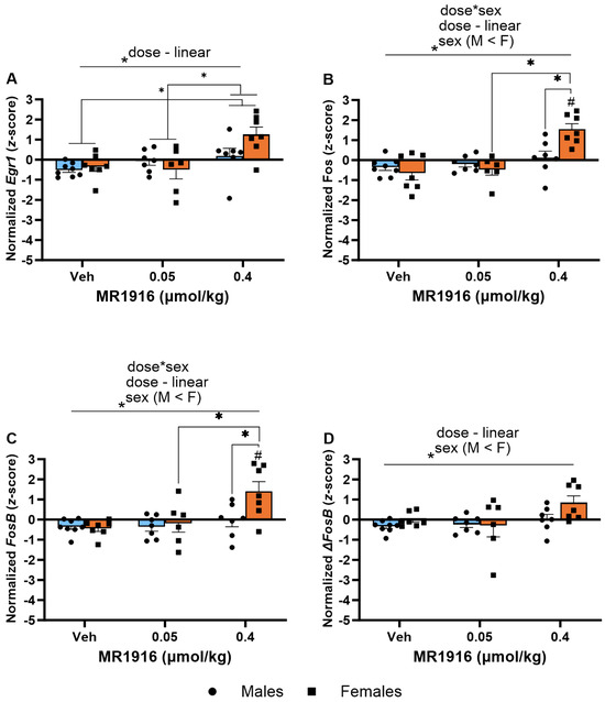 Effects of MR1916 on gene expression of (A) early growth response protein 1 (Egr1), (B) FBJ murine osteosarcoma viral oncogene homolog (Fos), (C) FBJ murine osteosarcoma viral oncogene homolog B (FosB), and (D) delta FBJ murine osteosarcoma viral oncogene homolog B (ΔFosB), in the ventromedial stratum of EtOH-naïve male (blue fill) and female (orange) rats after 90 min of treatment. Each bar represents the mean z-score ± standard error, showing individual values. N = 5–6/treatment/sex. Graph marked by the asterisk sign and a line have a significant between-subject effect (ANOVA). Bars marked by the asterisk sign and a bracket are significantly different from each other (LSD post hoc). Bars marked by the pound sign are significantly different from the respective vehicle control (LSD post hoc). #, * p < 0.05.