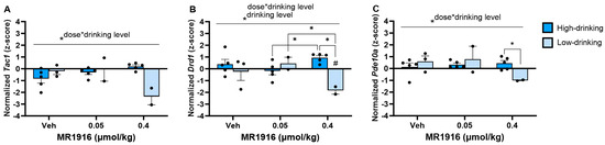 Effects of MR1916 on gene expression of (A) substance P (Tac1), (B) dopamine receptor 1 (Drd1), and (C) phosphodiesterase 10a (Pde10a), in the dorsal–lateral striatum of post-CIE male rats 90 min after treatment. Each bar represents the mean z-score ± standard error, showing individual values. N = 2–5/treatment/drinking level. Graph marked by the asterisk and a line have the indicated significant ANOVA effects. Asterisks with brackets also indicate significant pairwise differences between indicated groups (LSD or Dunnet’s T3 test). Bars marked by the pound sign are significantly different from their respective vehicle control (LSD test). #, * p < 0.05.