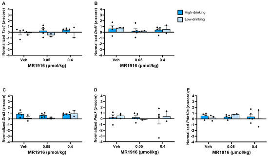 A comparison of MR1916 treatment effects in high- vs. low-drinking, post-CIE male rats showed a significant MR1916 X Drinking Level interaction (Table S2) in the expression of Tac1 (p = 0.001, Figure 12A), Drd1 (p = 0.008, Figure 12B), and Pde10a (p = 0.041, Figure 12C) in the DLS of post-CIE male rats. A pairwise comparison showed that the higher MR1916 dose (0.4 µmol/kg) decreased Drd1 in low-drinking post-CIE males vs. both their vehicle control (p = 0.045) and lower-dose-treated counterparts (p = 0.011). In contrast, high-drinking males injected with the higher MR1916 dose had a significantly higher Drd1 expression than those injected with the lower dose (p = 0.043) and, consequently, showed a higher Drd1 expression than low-drinking males injected with the higher dose (p = 0.001, Figure 12B). Similarly, low drinkers treated with the higher MR1916 dose showed a significantly lower (p < 0.05) Pde10a expression than high drinkers that received the same dose (Figure 12). A Drinking Level main effect (Table S2) reflected that high-drinking post-CIE male rats had a significantly higher Drd1 expression in the DLS than low-drinking males (p = 0.026, Figure 12B). An inspection of Figure 12 descriptively showed that these divergent effects were largest in high-dose-MR1916-treated rats. Accordingly, there was a significant direct correlation between the baseline drinking level with DLS Drd1 (r[7] = 0.85, p = 0.016) and Pde10a expression (r[7] = 0.87, p = 0.011) after MR1916 high-dose treatment. These relations were not seen under vehicle or low-dose treatment (Figure S3).