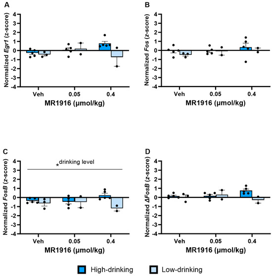 Effects of MR1916 on gene expression of (A) early growth response protein 1 (Egr1), (B) FBJ murine osteosarcoma viral oncogene homolog (Fos), (C) FBJ murine osteosarcoma viral oncogene homolog B (FosB), and (D) delta FBJ murine osteosarcoma viral oncogene homolog B (ΔFosB), in the dorsal–lateral striatum of post-CIE male rats 90 min after treatment. Each bar represents the mean z-score ± standard error, showing individual values. N = 2–5/treatment/drinking level. Graph marked by the asterisk and a line have the significant indicated ANOVA effect. * p < 0.05.