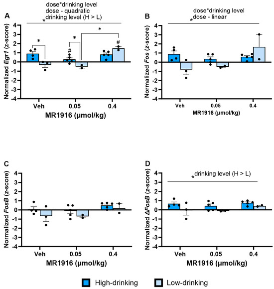 Effects of MR1916 on gene expression of (A) early growth response protein 1 (Egr1), (B) FBJ murine osteosarcoma viral oncogene homolog (Fos), (C) FBJ murine osteosarcoma viral oncogene homolog B (FosB), and (D) delta FBJ murine osteosarcoma viral oncogene homolog B (ΔFosB), in the ventromedial striatum of post-CIE male rats after 90 min of treatment. Each bar represents the mean z-score ± standard error, showing individual values. N = 2–5/treatment/drinking level. Graphs marked by the asterisk and a line have the significant indicated ANOVA effect. Bars marked by the asterisk and a bracket differ significantly from each other (LSD test). Bars marked by the pound sign differ significantly from their respective vehicle control (LSD test) #, * p < 0.05.