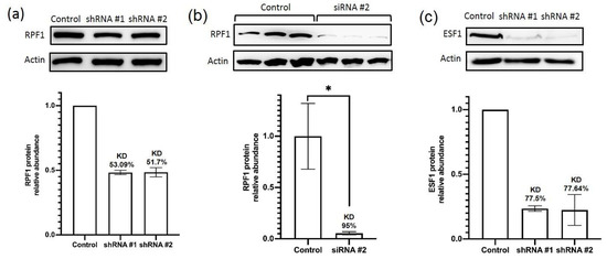 shRNA- and siRNA-mediated knockdown of RPF1 and ESF1 in HEK293 cells. (a) Western blot analysis of lysates obtained from the cells stably transduced by the scramble (control) or shRNAs against RPF1 mRNA (shRNA #1 and shRNA #2). Immunostaining of PAAG-separated proteins transferred to a membrane and probed with anti-RPF1 IgG is shown. Actin was used for normalization. Mean values of two independent experiments are shown. (b) Western blot analysis of lysates obtained from the cells transfected by the scramble (control) siRNA or siRNA #2 against RPF1 mRNA. Immunostaining of PAAG-separated proteins transferred to a membrane and probed with anti-RPF1 IgG is shown. Actin was used for normalization. Mean values of three independent experiments are shown. Star indicates statistically significant differences between control and cells with siRNA-mediated knockdown of RPF1 (* p < 0.05). (c) Western blot analysis of lysates obtained from the cells stably transduced by the scramble (control) or shRNAs against ESF1 mRNA (shRNA #1 and shRNA #2). Staining of PAAG-separated proteins transferred to a membrane and probed with anti-ESF1 IgG is shown. Actin was used for normalization. Mean values of two independent experiments are shown.