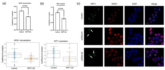 Relocation of NPM1 from the nucleoli to the nucleoplasm in HEK293 with RPF1 shRNA-mediated knockdown. (a) Quantifications of NPM1 in different parts of the nucleus (nucleoli vs. nucleoplasm) of cells with stably decreased RPF1 (shRNA-expressing constructs were integrated into the genome) relative to control cells. Coefficients of variation were calculated and plotted as boxplots with whiskers, as described in the Materials and Methods section. (b) Quantifications of the residual RPF1 signal in the nucleoplasm of cells with stably decreased RPF1 relative to the control cells. Coefficients of variation were calculated and plotted as boxplots with whiskers, as described in the Materials and Methods section. (c) Confocal images of HEK293 cells stably transduced by the scramble (control) or shRNAs against RPF1 mRNA (shRNA #1 and shRNA #2). Cells were grown on cover slides and fixed, permeabilized, and stained with the antibodies against NPM1, RPF1. DAPI was used to visualize the nuclei. Arrows indicate the residual signals from the RPF1 protein in the nucleoplasm. Stars indicate statistically significant differences between NPM1 localization and RPF1 residual fluorescence in nucleoli of control and cells with knockdown of RPF1 (**** p < 0.0001).