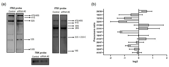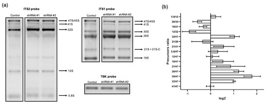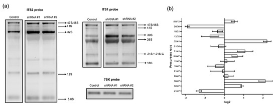 - Sloan, K.E.; Mattijssen, S.; Lebaron, S.; Tollervey, D.; Pruijn, G.J.; Watkins, N.J. Both endonucleolytic and exonucleolytic cleavage mediate ITS1 removal during human ribosomal RNA processing. J. Cell Biol. 2013, 200, 577–588. [Google Scholar] [CrossRef] [PubMed]