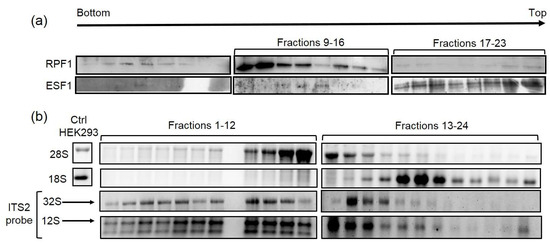 Downmodulating the key proteins by shRNA-mediated knockdown can have indirect effects on intracellular processes. Therefore, to prove that RPF1 and ESF1 are directly involved in ribosome biogenesis, it is necessary to demonstrate their interaction with the pre-60S and pre-40S ribosome subunits, respectively. To confirm this, sucrose gradient centrifugation experiments were performed. RNA and protein samples isolated from each fraction were analyzed by Northern and Western blotting followed by hybridization with oligonucleotides or immunodetection. Analysis of the Northern blotting hybridization with the specific probes for 28S and 18S rRNA demonstrated the sufficient separation of the 60S and 40S precursors (Figure 8b). Hybridization with the ITS2 probe revealed the enrichment of the loaded sample with the ribosomal precursors. The obtained results demonstrate the presence of the pre-ribosomal particles containing the 32S and 12S precursors, implying the efficient removal of cytoplasmic mature subunits (Figure 8b). Western blots with anti-RPF1 and anti-ESF1 antibodies revealed the co-sedimentation of RPF1 with the pre-60S particle (Figure 8a), while ESF1 co-sedimented with the pre-40S precursor (Figure 8a).