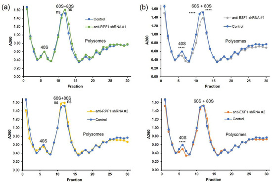 3.6. Cells with RPF1 and ESF1 Knockdown Have Polysome Profiles Similar to Wild-Type Control Ones