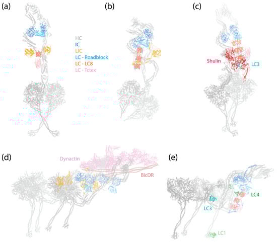 The assembly of the dynein-1 complex revolves around the HC, which is the largest subunit within dynein-1 (Figure 1a,d). The C-terminal motor domain of the HC is responsible for enzymatic activity, while its N-terminal tail, comprising a series of relatively flexible HBs, acts as a platform for the attachment of other non-catalytic subunits. Both IC and LIC make direct contact with the HC: the IC binds at the HC’s HB 4 and 5 [7], and the LIC binds at HB 6, positioning itself between the IC-binding site and the motor domain [7,68]. Mammalian dynein-1 features three different LCs that associate with the ICs, facilitating their dimerization. In the autoinhibited state, the IC-LC complex wraps around the HC, with the LCs making contact with the HC’s neck [6]. This interaction may contribute to the autoinhibition of dynein-1.