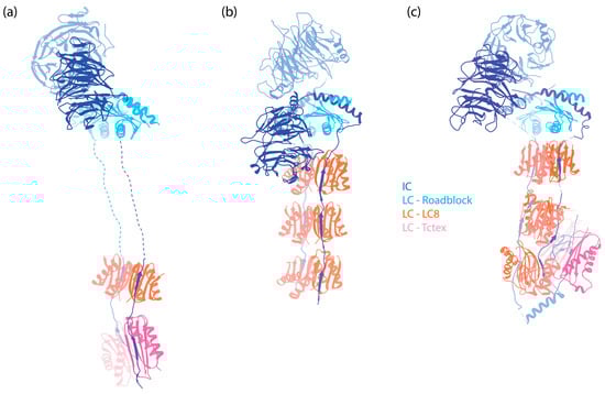 Mammalian dynein-1 has three different LCs (Figure 6a–c), each with two homologs: Roadblock (DLRB1 and DLRB2), LC8 (DYL1 and DYL2), and Tctex (DYLT1 and DYLT3). They bind the IC in a 2:2 ratio, forming the IC-LC subcomplex.