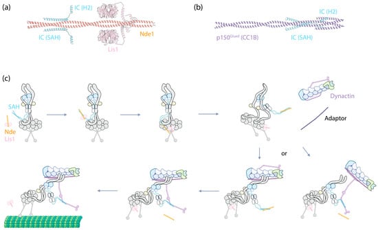 Collectively, the emerging evidence suggests a probable mechanism where the IC serves as a central hub, modulating the binding of dynein cofactors to activate dynein (Figure 3c). Upon Lis1 binding to Nde1/Ndel1, Nde1/Ndel1 facilitates Lis1’s recruitment to the autoinhibited dynein complex by interacting with the IC SAH. After this binding event, it is plausible that the interaction either weakens the affinity of Lis1 for Nde1/Ndel1, given their proximity at the binding sites, or Lis1 simply exhibits a higher affinity for the motor domains. In either case, Lis1 detaches from Nde1/Ndel1 and instead interacts with the nearby dynein motor domains, acting like a wedge between them [99]. This interaction transforms the autoinhibited dynein into a conformation that is more amenable to assembling with dynactin and an adaptor.