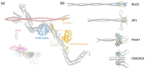 Similarly, helix-1 uses the same hydrophobic surface to interact with BicD2 and CRACR2A [115]. ColabFold predictions are consistent with these findings, suggesting interactions between LIC1 helix-1 and BicD2, JIP3, Hook1, and CRACR2A, as depicted in Figure 5b. The cryo-EM structure of the DDR complex provides an additional validation for these interactions, revealing that the region following the globular Ras-like domain in LIC extends along the HC tail HB5, reaching for the BicDR1 adaptor with helix-1 (Figure 5a) [7].