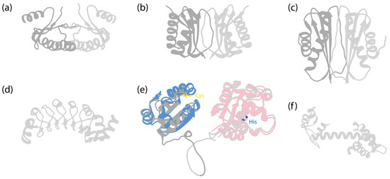 Structures of dynein LCs. (a) Solution structure of dimeric human Roadblock-1 [145] (PDB 1Z09). (b) Crystal structure of dimeric Drosophila melanogaster LC8 [146] (PDB 3BRI). (c) Crystal structure of dimeric Drosophila Tctex-1 [147] (PDB 1YGT). (d) Crystal structure of Chlamydomonas LC1 [148] (PDB 5YXM). (e) AlphaFold-predicted human TXND6 structure. Dark grey is for the thioredoxin domain, and light grey is for the nucleoside diphosphate kinase domain. The disordered N-terminal amino acids 1–10 and C-terminal amino acids 301–330 were removed for clarity. Blue indicates the predicted structure of human thioredoxin (Uniprot P10599), which was structurally aligned to TXND6, using UCSF Chimera [112]. LC3 and LC5 of Chlamydomonas [10] and LC3BL of Tetrahymena [9,45] have similar folds (not shown). The two cysteine residues in the -Cys-X-X-Cys- motif are highlighted by sulfur atoms (yellow) (Cys39 and Cys42 in TXND6; Cys32 and Cys35 in thioredoxin). Pink indicates the predicted structure of human nucleoside diphosphate kinase A (NDKA, Uniprot P15531), with amino acids 136–152 removed for clear depiction, and structurally aligned to TXND6. The conserved histidine residue is highlighted by the nitrogen atom (blue) (His279 in TXND6; His118 in NDKA). (f) AlphaFold-predicted structure of Chlamydomonas LC4 (Uniprot Q39584).