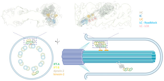 - Lacey, S.E.; Foster, H.E.; Pigino, G. The Molecular Structure of IFT-A and IFT-B in Anterograde Intraflagellar Transport Trains. Nat. Struct. Mol. Biol. 2023, 30, 584–593. [Google Scholar] [CrossRef]