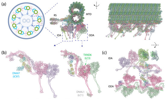 The axoneme, a highly complex and organized structure found in motile cilia, plays a crucial role in cellular locomotion and fluid flow on the surface of various human cells, including those in the nervous system [222], the respiratory tract [223], and the motility of sperm [224]. In motile cilia, a row of dyneins forms the outer dynein arms (ODAs) that anchor on the A-tubule of MTDs via docking complexes, and another row of dyneins forms the inner dynein arms (IDAs) [44,225], which also anchor on the A-tubule (Figure 8a). The dyneins dynamically bind to or dissociate from the B-tubule of neighboring MTDs depending on the nucleotide states of their motor domains. An extensive protein network, consisting of MT inner proteins (MIPs), resides within the lumen of the MTD tubules. Nexin–dynein regulator complexes (N-DRC) link neighboring MTDs and regulate ciliary motility, while radial spokes (RSs) connect MTDs to the central apparatus (CA)—the central two singlet MTs shrouded with protein complexes. Recent advances in cryo-EM microscopy and image processing techniques have significantly enriched our molecular understanding of axonemes (reviewed in [226]), revealing detailed architectures of the full axoneme [10,227] and its components, such as ODAs [9,29,45,228,229], MIPs [230,231,232], N-DRC [233], RSs [234,235,236], and CA [237,238].
