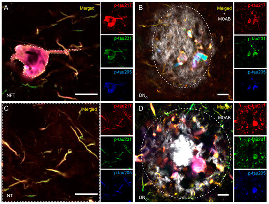 Individual and merged p-tau immunostainings and region of interest (ROI). Images in (A–D) show the tau structures analyzed in Cohort I. Large images in (A–D) show p-tau217 (red in the small image), p-tau231 (green in the small image), and p-tau205 (blue in the small image) in neurofibrillary tangles (NFT) (A); dystrophic neurites in plaques without a core (DNC−) are shown in (B); and neuropil threads (NT) and dystrophic neurites in cored plaques are merged (DNC+), as shown in (D). Representative regions of interest (ROIs) of the different tau structures are indicated by a dashed line in (A–D). Scalebar = 10 µm (A,C) and 20 µm (B,D).