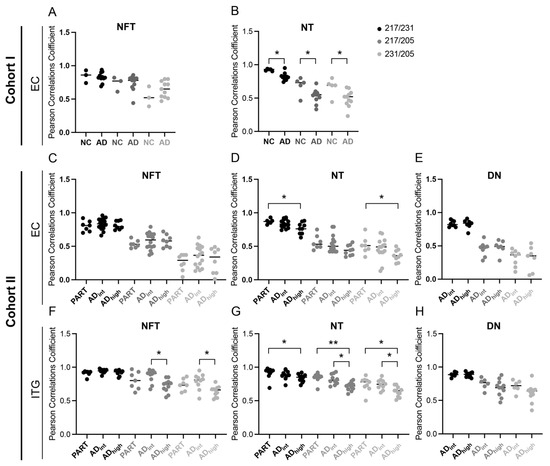 Pearson correlation coefficient (PCC) of p-tau217, p-tau231, and p-tau205 in diagnosis groups. Graphs illustrating the PCC when analyzing the co-localization between the three p-tau variants in neurofibrillary tangles (NFTs) in entorhinal cortex (EC) of Cohort I (A), neuropil threads (NTs) in EC of Cohort I (B), NFTs in EC of Cohort II (C), NTs in EC of Cohort II (D), dystrophic neurites (DNs) in EC of Cohort II (E), NFTs in inferior temporal gyrus (ITG) of Cohort II (F), NTs in ITG of Cohort II (G), and DN in EC of Cohort II (H). Data were analyzed using Mann–Whitney test (A,B) and Kruskal–Wallis one-way analysis of variance (C–H). Each point represents a mean of five pictures from each individual. * p < 0.05; ** p < 0.01.