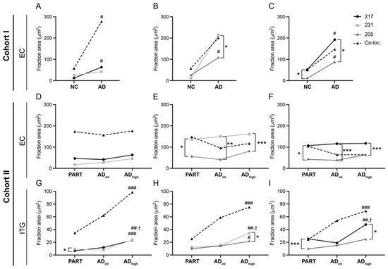 Area fraction of co-localized and non-co-localized p-tau217, p-tau231, and p-tau205 in neuropil threads. Graphs illustrating the area fraction of the three p-tau variants in neuropil threads (NTs) in entorhinal cortex (EC) of Cohort I (A–C), NT in EC of Cohort II (D–F), and NT in inferior temporal gyrus (ITG) of Cohort II (G–I), where p-tau217, p-tau231, and their co-localizations are seen in (A,D,G); p-tau217, p-tau205, and their co-localizations are seen in (B,E,H); and p-tau217, p-tau205, and their co-localizations are seen in (D,F,G). Data were analyzed using Mann–Whitney test (A–C) and Kruskal–Wallis one-way analysis of variance (D–I). The points represent the median of the mean area fraction in five images of each case in the different diagnosis groups. * p < 0.05, ** p < 0.01, and *** p < 0.001 when comparing non-co-localized p-tau217 vs. p-tau231, p-tau217 vs. p-tau205, and p-tau231 vs. p-tau205. # p < 0.05, ## p < 0.01, and ### p < 0.001 when comparing PART vs. ADhigh, and † p < 0.05 when comparing ADint vs. ADhigh.