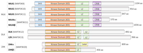 Mixed-lineage kinase (MLK) subfamilies. Schematic depiction of the functional domains of different MLK family members (not to scale). MLK (mixed-lineage kinase), DLK (dual leucine zipper kinase), LZK (leucine zipper kinase), ZAK (sterile alpha motif and leucine zipper containing kinase AZK), SH3 (Src homology 3 domain), LZ (Leucine Zipper), CRIB (Cdc42/Rac interactive-binding), and SAM (sterile-α motif). NCBI RefSeq accession numbers (if applicable): MLK1/MAP3K9 (NP_001271159.1, Isoform 2), MLK2/MAP3K10 (NP_002437.2), MLK3/MAP3K11 (NP_002410.1), MLK 4/MAP3K21 (CAC84639.1, Isoform 1/α; NP_115811.2, Isoform 2/β), DLK/MAP3K12 (NP_001180440.1, Isoform 1), LZK/MAP3K13 (NP_004712.1, Isoform 1), and ZAK/MAP3K20 (NP_057737.2, Isoform 1/α; NP_598407.1, Isoform 2/β).