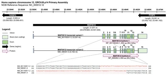 The human MAP3K12 gene spans 21.871 nucleotides (nt) and is located on the complementary strand of chromosome 12, GRCh38.p14 Primary Assembly. It is flanked by the gene encoding for the TARBP2 subunit of the RISC loading complex (TARBP2) and the poly(rC) binding protein 2 (PCBP2) gene, both located on the positive strand in opposite directions relative to the DLK gene. The transcripts of the human DLK Isoforms 1 (NM_001193511.2) and 2 (NM_006301.4) differ in a 99 nt stretch that is absent in Isoform 2, resulting in a slightly shorter protein of 859 amino acids (aa) and a calculated molecular weight of 93.2 kDa, instead of 892 aa and 96.3 kDa (NCBI, https://www.ncbi.nlm.nih.gov/gene/7786, 30 June 2023, 14:33. conserved) (Figure 2).