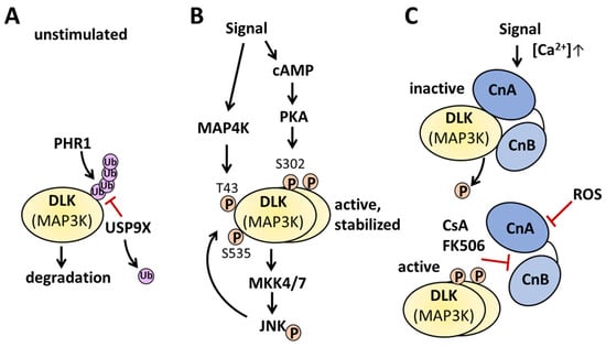 Already, the first studies on DLK showed that this kinase is heavily phosphorylated, and the overexpression of DLK alone is sufficient to activate this kinase [47,72]. At least some phosphorylation sites and DLK phosphorylating kinases have been identified in the meantime. Upon homodimerization via its leucine zipper domains, DLK becomes auto-phosphorylated in trans at Ser-302 (Figure 3B) [11,56,73].