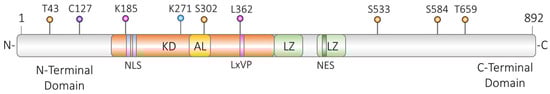 DLK amino acid residues are modulated at the post-translational level. Isoform 1 of human DLK is depicted; T—threonin; C—cystein; K—lysin; S—serin; orange dots—phosphorylation and, possibly, dephosphorylation sites; violet dot—palmitoylation site; blue dot—ubiquitylation and SUMOylation site. KD—kinase domain; AL—activation loop within the kinase domain; LZ—leucine zipper for homodimerization; NLS—bipartite nuclear localization site; NES—nuclear export site; K185—ATP binding site; L—leucine; x—any amino acid; V—valine; P—proline; LxVP—interaction site with calcineurin. For further information, please see the text.