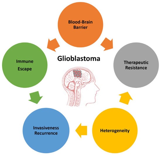 The poor prognosis of GB and the objective difficulties in developing successful therapies are due to the complex and unique features characterizing this type of tumor. This paragraph summarizes the main attributes of GB (Figure 1) to highlight the direction that basic investigations, research and development, and technology transfers should take.
