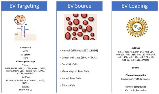 Tumor-derived EVs (TDEVs) can be also used as natural carriers for the delivery of antioncogenic molecules [], thanks to their high tumor targeting and permeability, making them a technological Trojan horse, as evoked by Simionescu and coauthors []. EVs isolated from engineered patient-derived GSCs and carrying the miR-302-367 cluster are rapidly internalized by neighboring GB cells, and are able to inhibit GB cell proliferation, stemness, and invasion through the repression of the Cyclin A, Cyclin D1, E2F1, and CXCR4 pathways []. In addition, GDEVs that were engineered with miR-124, miR-128, or miR-137 improved the survival rate of a GB mouse model when combined with chemotherapy [], whereas GDEVs carrying miR-151a reduced chemoresistance in GB xenograft mouse models []. Cell treatment with miRNA-specific inductors can also be used as a valid alternative to external loading to obtain EVs carrying specific miRNA molecules. This is the approach used by Wang and coauthors, which employed traditional medicine substances to induce GDEVs’ miR-7-5p enrichment []. As a result, GDEVs carrying miR-7-5p reduced GB formation and metastasis in GB nude mouse models []. The exploitation of GDEVs as drug carriers for GB therapy requires an extremely careful evaluation of the antioncogenic properties of the loaded therapeutic molecule vs. the oncogenic potential of the GDEVs’ intrinsic cargo as well as a relative cost–benefit assessment. Guo and coworkers recently identified a saponin-mediated cargo elimination strategy to improve the biosafety of GDEVs in GB therapy applications []. A systematic analysis of the original proteins and RNAs together with functional in vitro and in vivo assays confirmed the high efficiency of the method in eliminating GB-EV cargo, and its inherited abilities in promoting GB progression, without affecting uptake by GB cells. Furthermore, saponin-treated GDEVs loaded with doxorubycin displayed an effective tumor-suppressive role in both subcutaneous and orthotopic GB mouse models []. These data are extremely promising and could be exploited to develop novel visionary therapeutic pipelines. These could involve isolating TDEVs directly from the patients, disarming their oncogenic properties through cargo elimination protocols, loading and/or functionalizing them with anticancer molecules, and administrating them to the patient. Finally, although TDEVs preferentially target (and are uptaken by) the cells of the same tumor type, TDEVs’ surface can be functionalized with specific molecules involved in EV–cell interactions to improve or alter natural tumor tropisms. Geng and coauthors have shown that GDEVs are more easily uptaken by GB cells than other type of tumor cells such as pancreatic cancer (PC) cells, and vice versa []. However, functionalizing EVs with cyclic arginine-glycine-aspartic acid-tyrosine-cysteine (cRGDyC), a ligand for the integrin αvβ3 enriched in GB cells, enhances the ability of PC cells (and also the GB cells themselves) to target and be internalized into GB cells [].