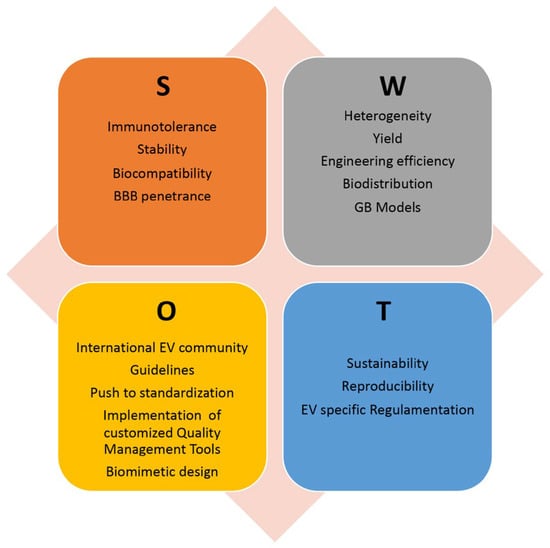 Despite these promising results, there are currently no ongoing clinical trials for EV-based GB treatment; however, EV-based therapies are being evaluated in clinical trials for the treatment of other types of tumors. This paragraph outlines the main issues and directions to explore in order to find the optimal solutions and fully realize the potential of EVs as an advanced therapeutic platform for GB treatment. Figure 3 shows an analysis of the Strengths, Weaknesses, Opportunities, and Threats (SWOT) of using EVs in novel GB therapeutic strategies.